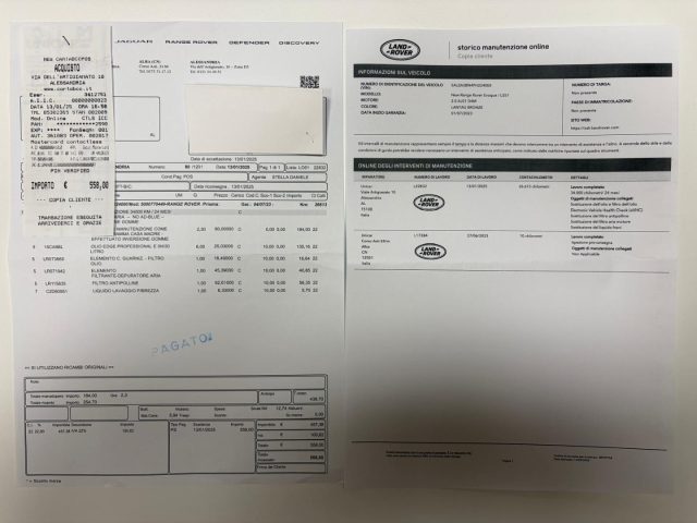 TAGLIANDO DI MANUTENZIONE ESEGUITO PRESSO NOSTRA OFFICINA UFFICIALE LAND ROVER, -RICEVUTA E ATTESTATO SERVICE DIMOSTRABILI.